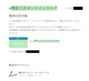 発送連絡のメールが来た~♪【野原工芸 木のボールペン】