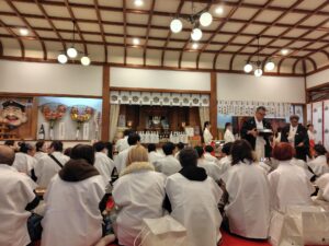 拝殿でお祓いを受けて、開運殿大広間に移り、直会膳のあと、お楽しみの福引。今年は福扇が当たりました(^^)3人でしっかりと商売繁昌を祈願してきました。